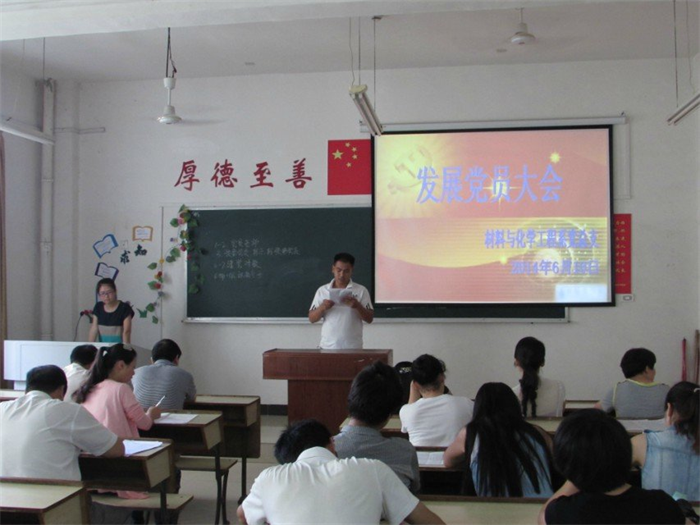 2014年6月10日,材料与化学工程系党总支在鼎新楼2313召开了发展党员大会,参加此次会议的有材料与化学工程系全体党员、学生预备党员、建党对象、入党积极分子。
