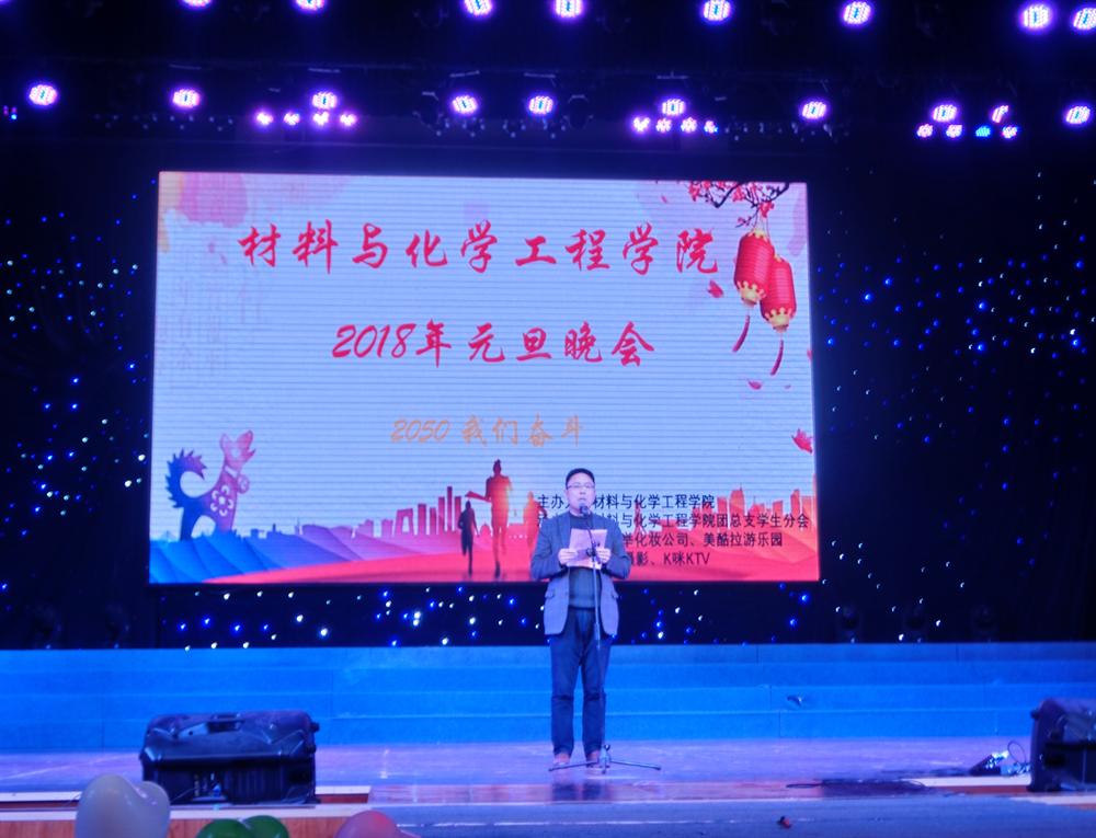 晚七点十分,晚会正式开始。由SDT乐队精彩开场,瞬间将现场的气氛点燃。随后主持人王焘、曹昱珅、杨锐、吕玉琳上台介绍出席本次晚会的领导、老师。材料与化学工程学院院长邱建丁为此次晚会深情致辞,肯定了材化学院强大的师资力量,表示未来我院的师资力量仍会不断加强,并鼓励同学们勤奋学习、努力奋斗、志存高远、锤炼品德、紧跟时代的步伐,为自己的明天加油喝彩!随后晚会表演正式开始。整个晚会表演分为峥嵘岁月、青春路上、我们奋斗三个阶段。