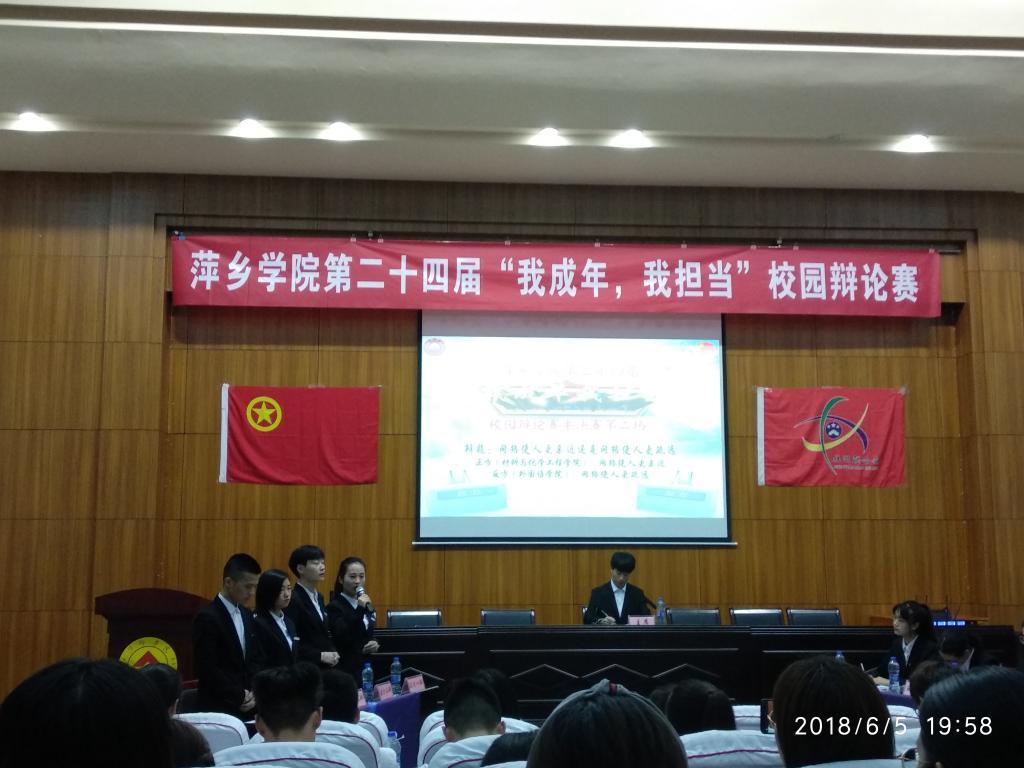 群雄舌战展雄风,争锋相对辩天下。经过激烈的竞争选拔,材料与化学工程工程学院在众多学院中脱颖而出成功打入萍乡学院第二十四届“我成年、我担当”辩论赛晋级赛。6月5日,比赛于宜萱楼学术报告厅隆重举行。校团委书记刘德平、校团委办公室主任罗红霞、体育学院团总支书记刘晔、学前教育学院团总支书记郑娟等纷纷应邀出席作为本次比赛的评委嘉宾。