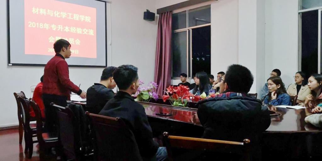 为进一步加强我院学生对专升本考试的了解和对考试的准备,材化学院于2018年11月29日晚7点在鼎新楼三楼会议室成功举办专升本经验交流会暨动员会。本次会议邀请了材化学院党总支副书记向芸老师;15级四位成功通过专升本考试的学长、和16、17级部分学生参会。