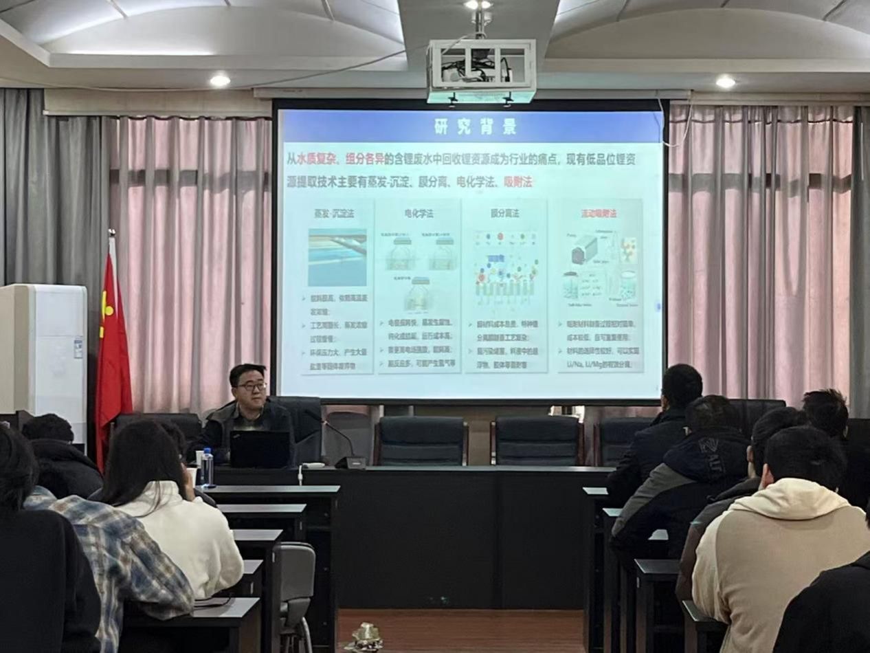 紧接着,井冈山大学博士生导师杨光教授以《高分子锂靶向吸附材料的设计、制备与应用研究》为题展开分享。杨光教授长期专注于退役锂离子动力电池回收及资源循环再生利用研究,在锂资源回收功能材料领域成果丰硕。报告中,他聚焦高分子锂靶向吸附材料这一核心研究方向,以通俗易懂的语言解析了材料的设计原理、制备工艺及在退役动力电池锂回收中的应用效能。通过对比不同吸附材料的性能差异,杨教授重点强调了高分子锂靶向吸附材料在提升锂回收效率、降低回收成本方面的独特优势,并与师生深入交流了该材料在实际场景中的最新应用进展。