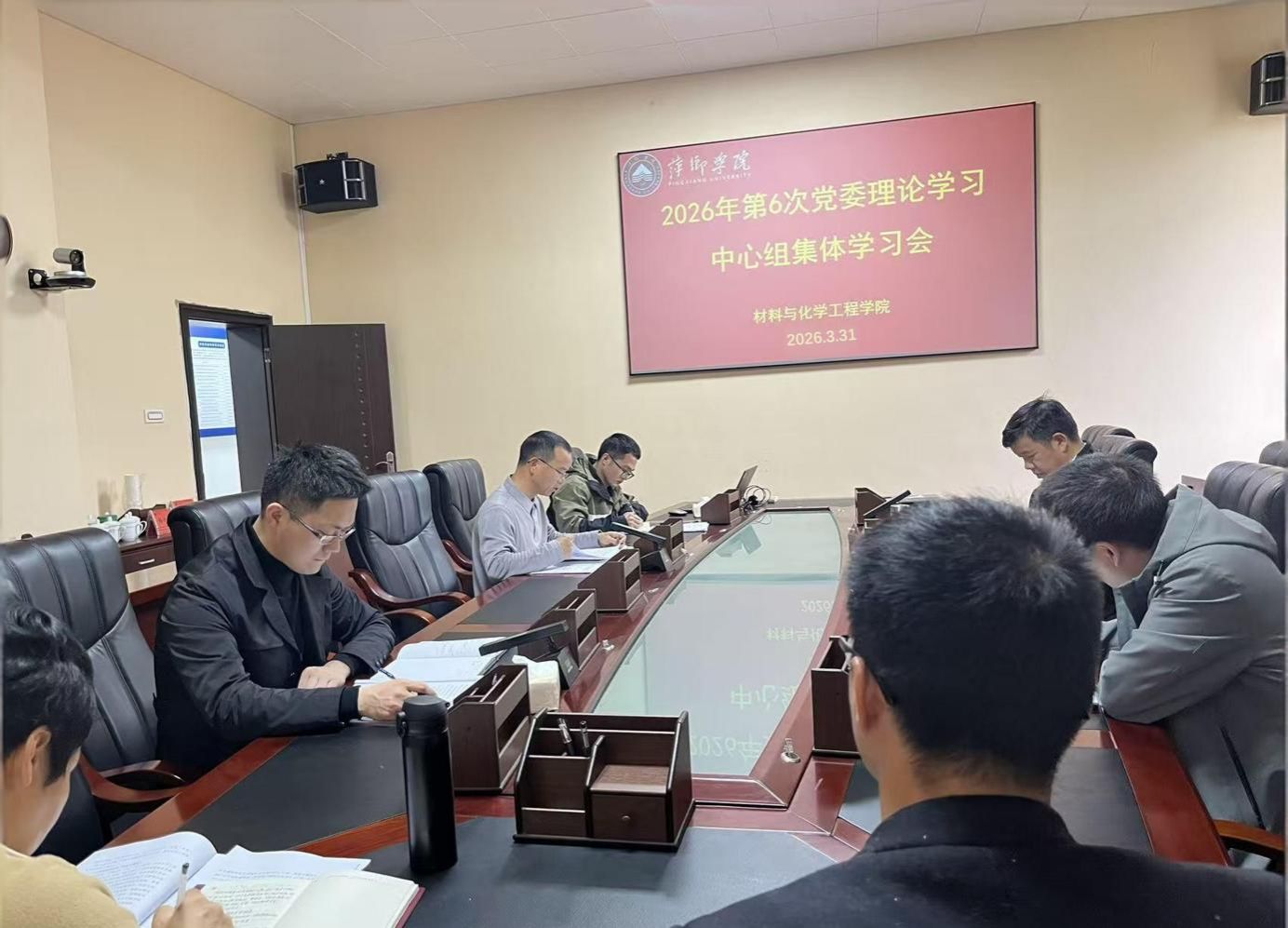 3月31日下午,萍乡学院材料与化学工程学院在鼎新楼三楼会议室召开2026年第6次党委理论学习中心组集体学习会,专题学习习近平总书记关于树立和践行正确政绩观的重要论述。学院班子成员、党委委员、科长、党支部书记及马克思主义学院党委宣传委员段杉参加学习,学院党委书记陈林主持会议萍乡学院。