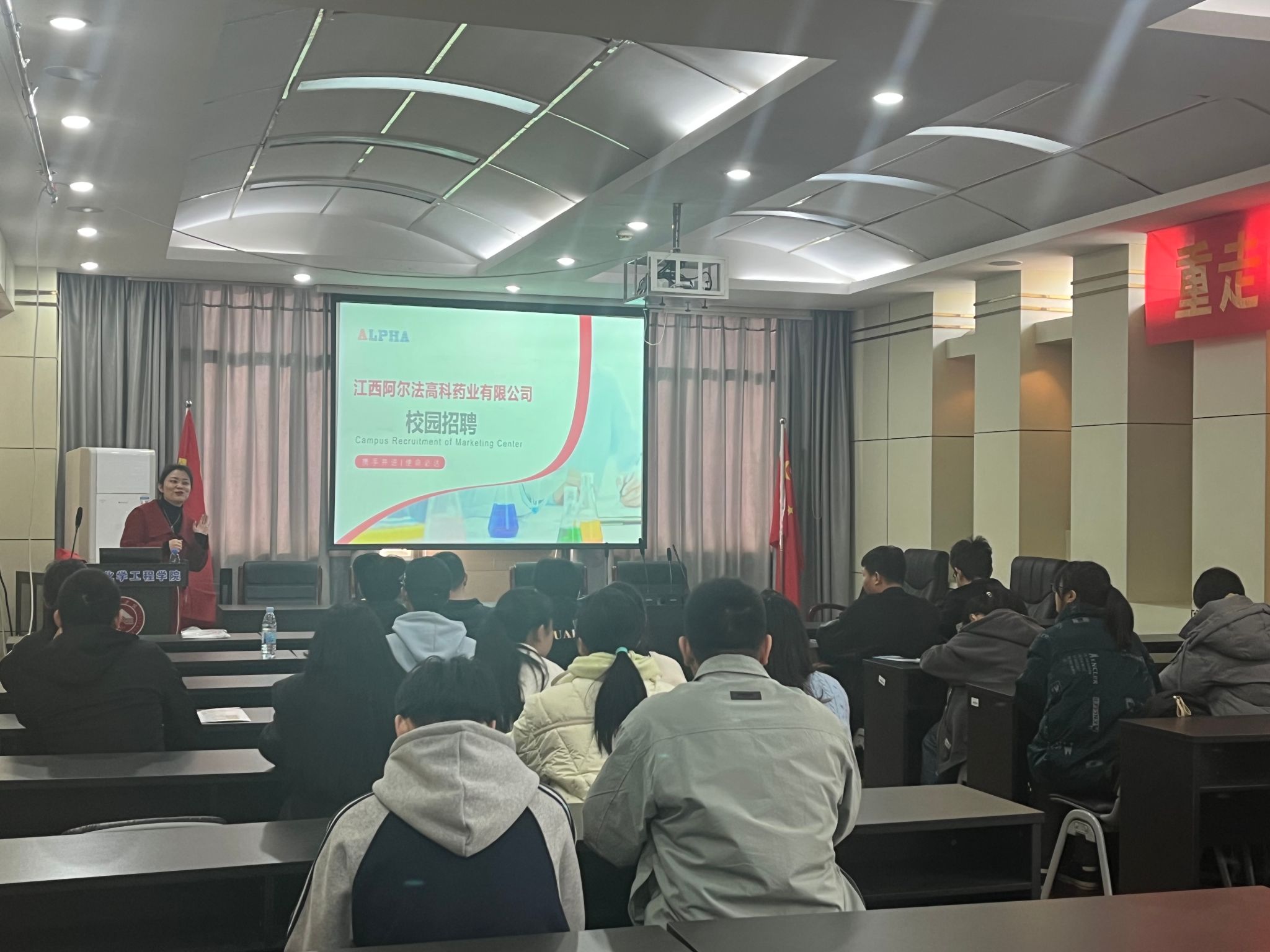 2023年12月8日上午,我院邀请江西阿尔法高科药业有限公司在鼎新楼2301会议室举办专场招聘宣讲会。此次宣讲会由阿尔法高科药业有限公司行政人事部邓经理主持,我院30余位应用化学等专业毕业生参加了本次招聘会。