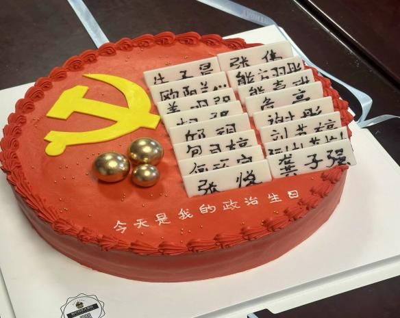 普通人的生日只有一个就是出生的那天,但对于共产党员来说却有着两个生日,除了出生日之外,另一个特殊的生日就是政治生日。从被党支部通过为预备党员的那一天起,党员的政治生命随之开始,也就拥有了自己的政治生日。为表达祝福,支部为同学们准备了蛋糕。